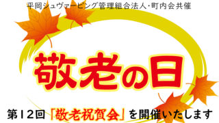 敬老祝賀会のご案内 平岡シュヴァービング管理組合法人・町内会共催第12回「敬老祝賀会」を開催いたします 日時:9月15日(月)11時30分から13時30分   ※受付開始11時15分から場所:マンション集会室   ご案内対象者:満75歳以上...