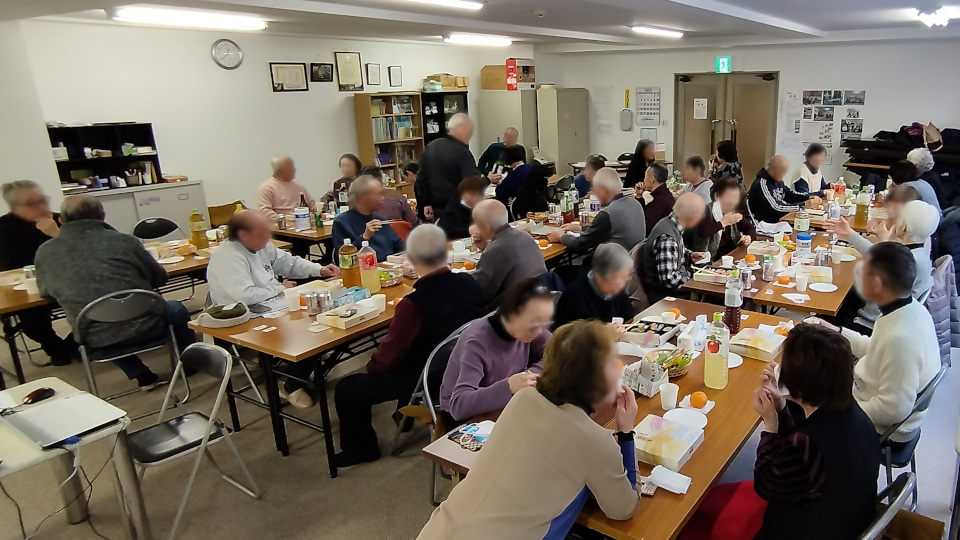 新年会半ば、お弁当をいただきながら、話がはずみます